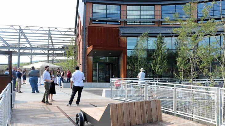Hazelwood Green is a massive brownfield redevelopment of an old industrial site along the Monongahela River. Owned and guided by members of Pittsburgh’s philanthropic community, this site aims to be a model for transformative redevelopment that prioritizes sustainability, equity, and inclusive economic opportunity. Two key properties on the site – Mill 19 and the Roundhouse – have been renovated and are in use. Mill 19 is now home to the largest single-sloped solar array in North America, and the Roundhouse incorporated local artists and makers throughout the space. Both structures offer a glimpse into our region’s history and our future, serving as innovation hubs and gathering spaces.